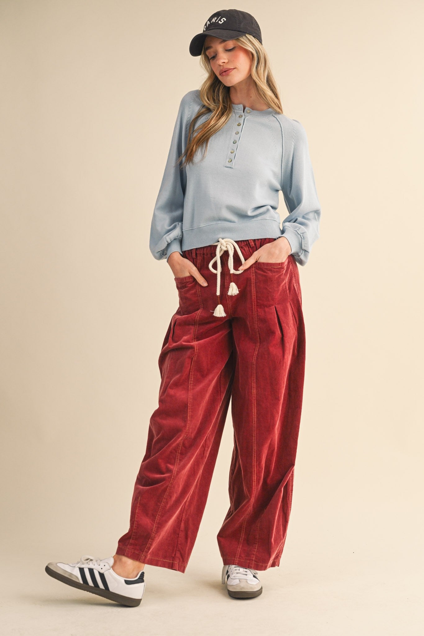 Sturdy washed corduroy fabric shapes these stylish bottoms with a high drawstring waist and barrel-cut pant legs that fall to ankle-length hems. Oversized pockets with pleating detail adds a unique touch.