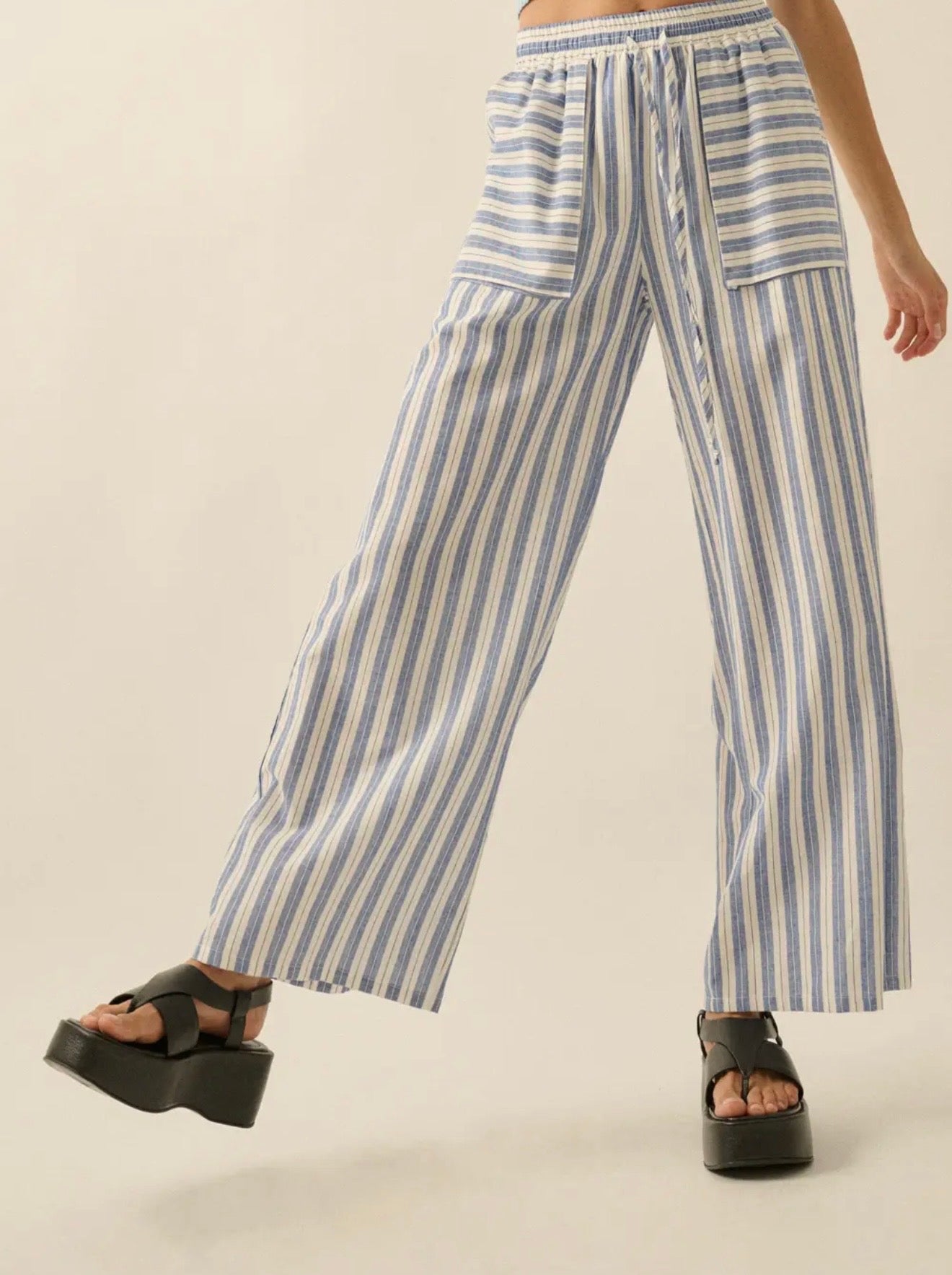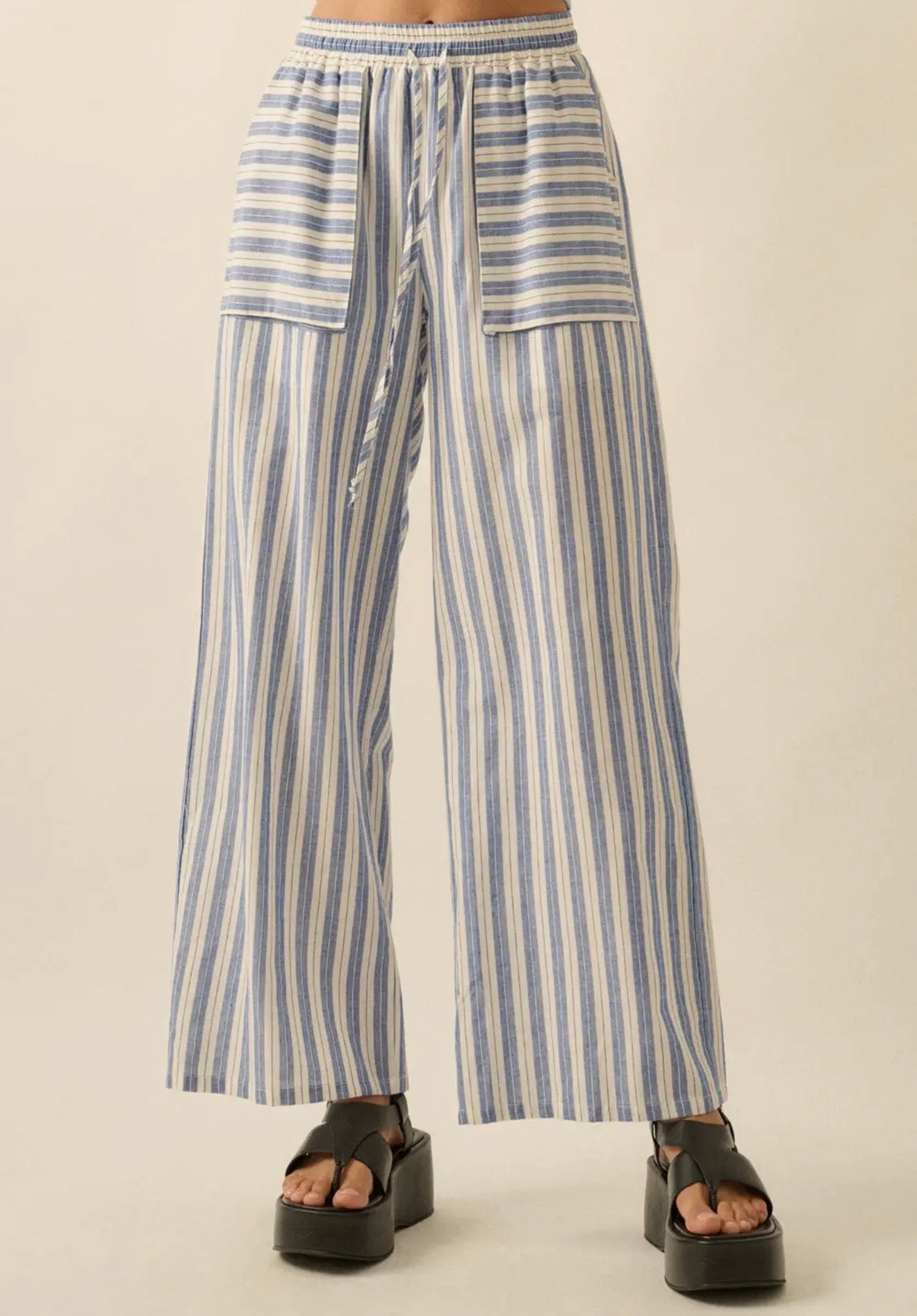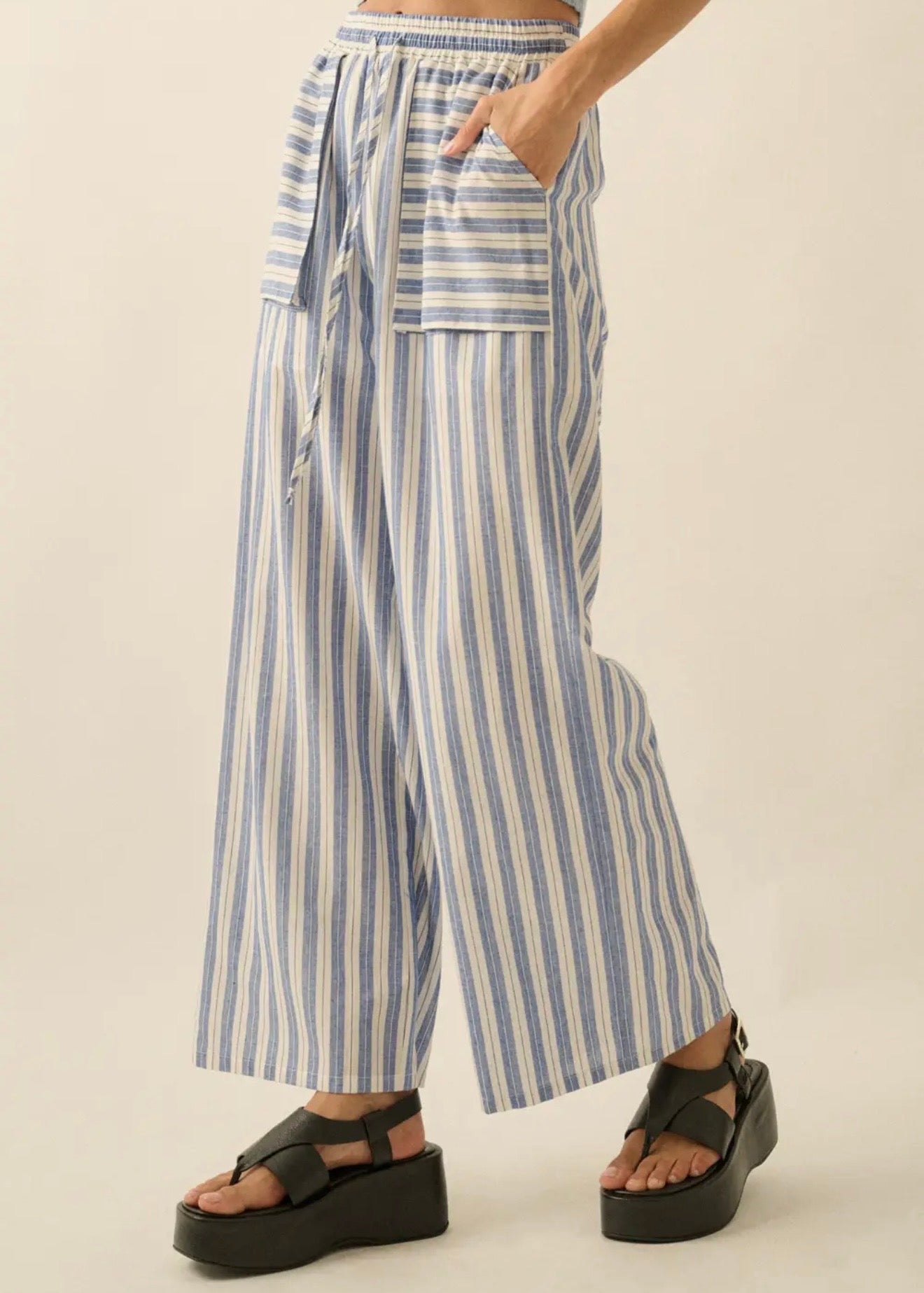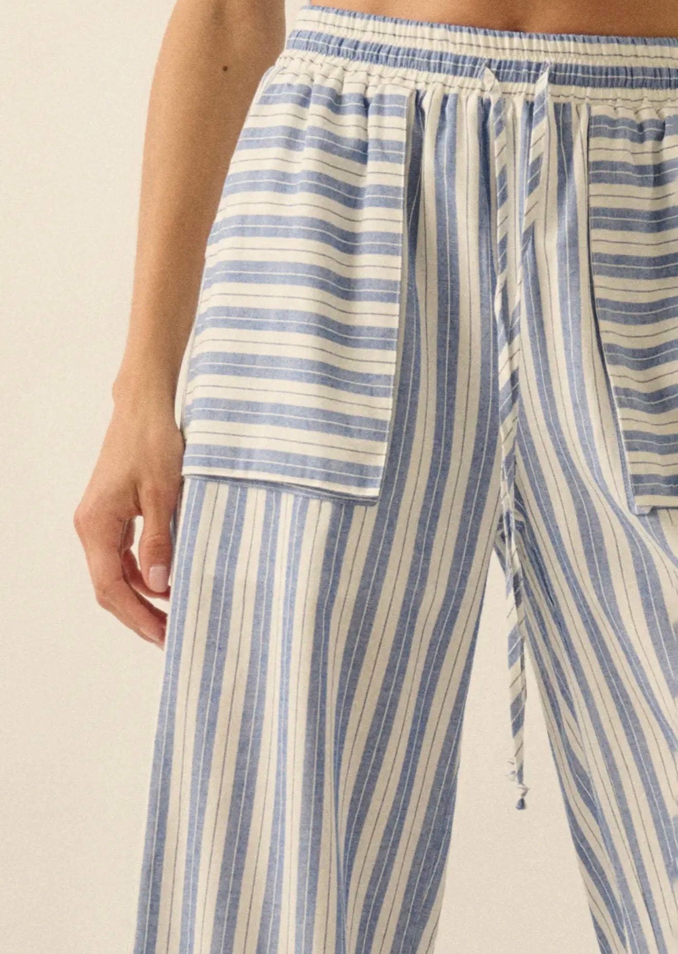 A pair of striped, woven cotton pants with the following features:Drawstring elastic waist.Front patch pockets.Wide leg.Partial thigh-length lining.Ankle length.Relaxed fit.