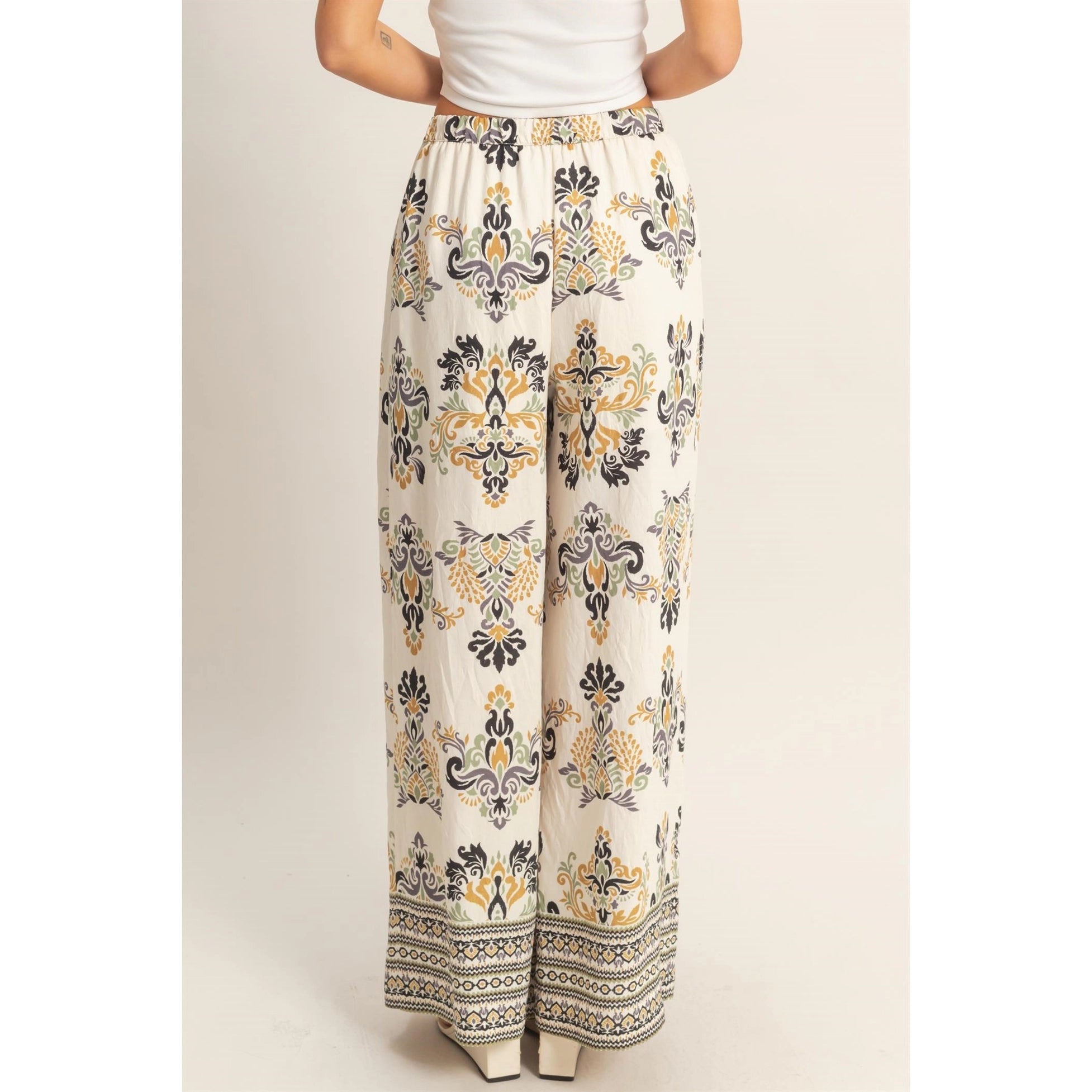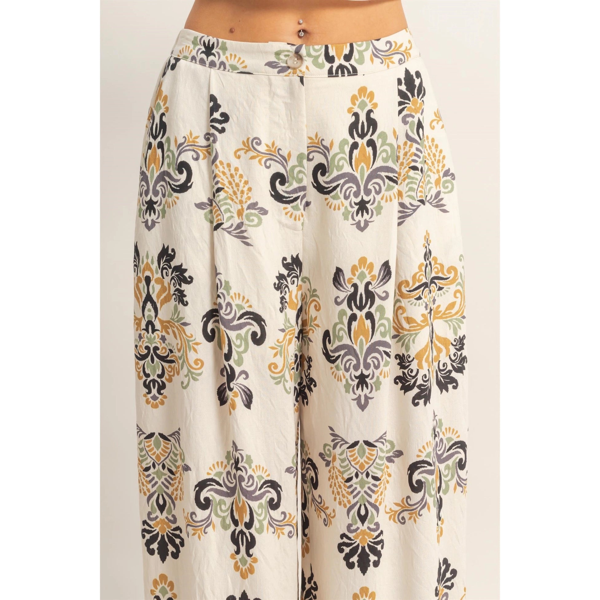 Embrace bold prints with these wide-leg palazzo pants, featuring a striking golden pattern and comfortable waistband. Style with a fitted top for a balanced silhouette.