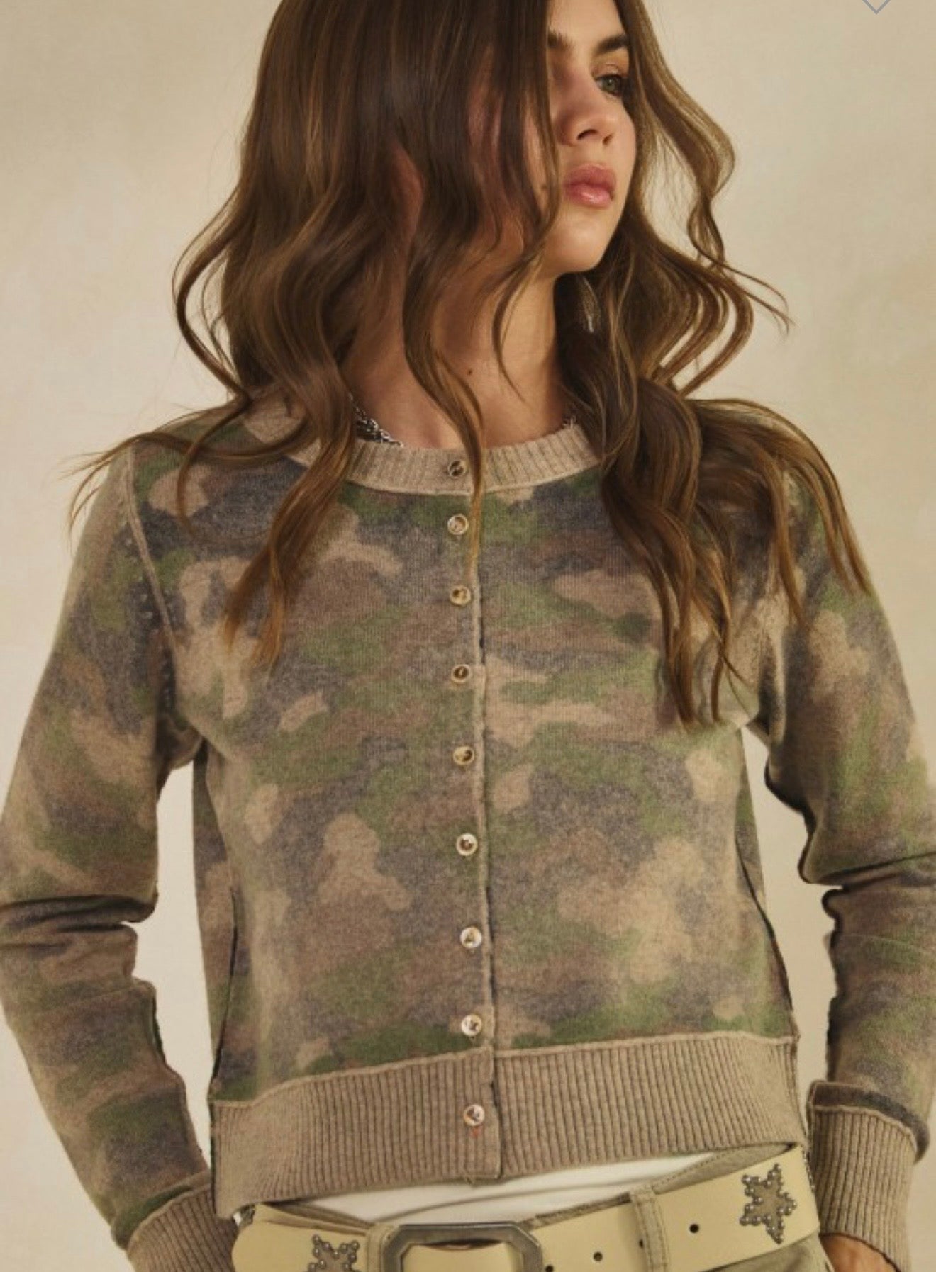 Camo print front button cardigan sweater.