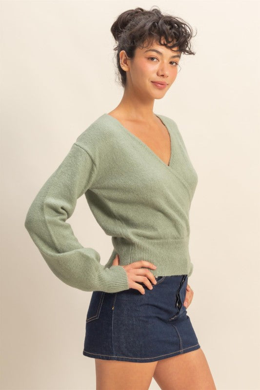 This features a flattering V neckline with an overlapping front. It has a relaxed drop shoulder and is finished with ribbed cuffs and him. The fitted waistband adds the perfect structure.