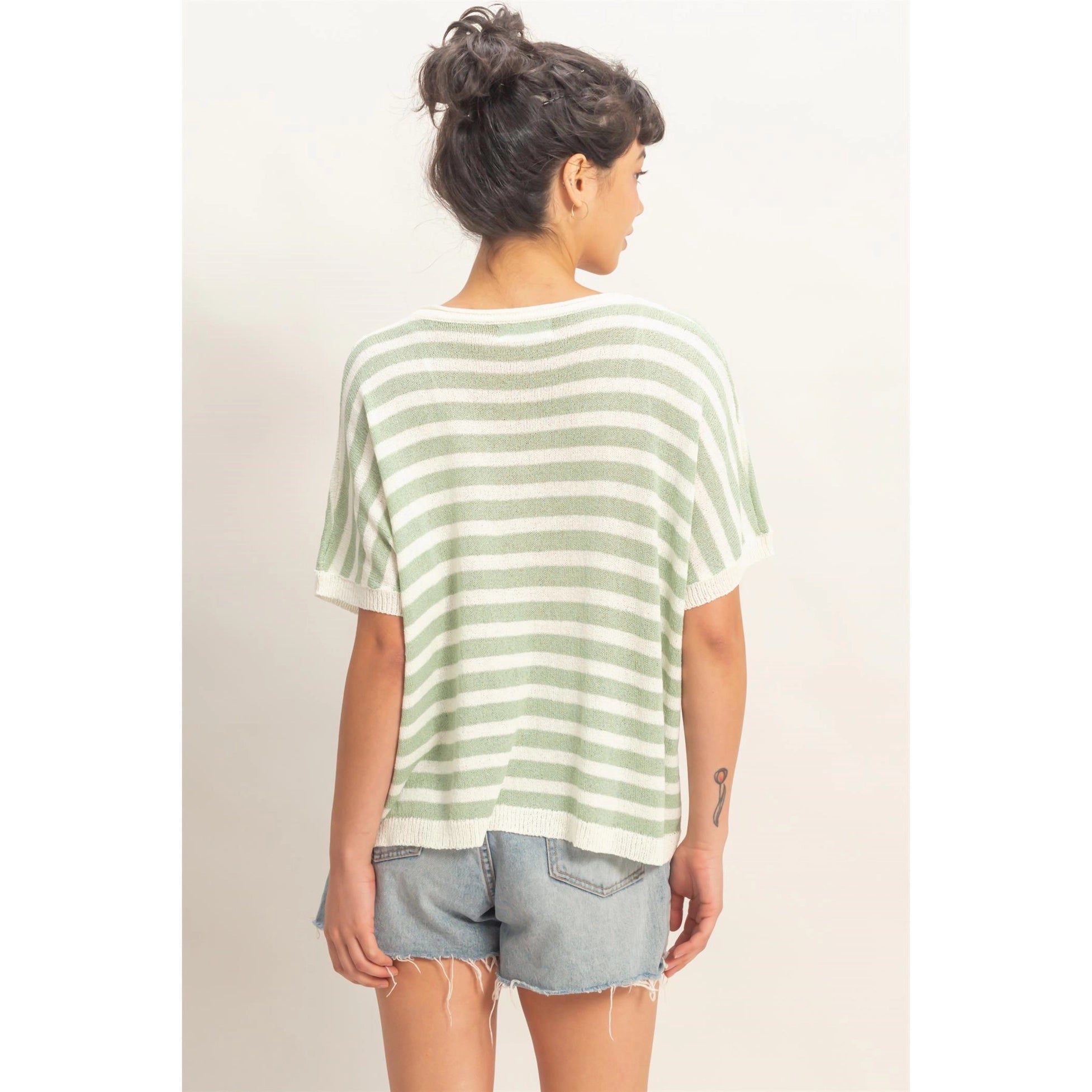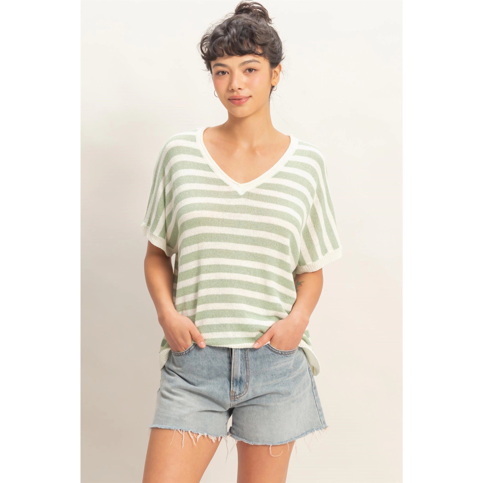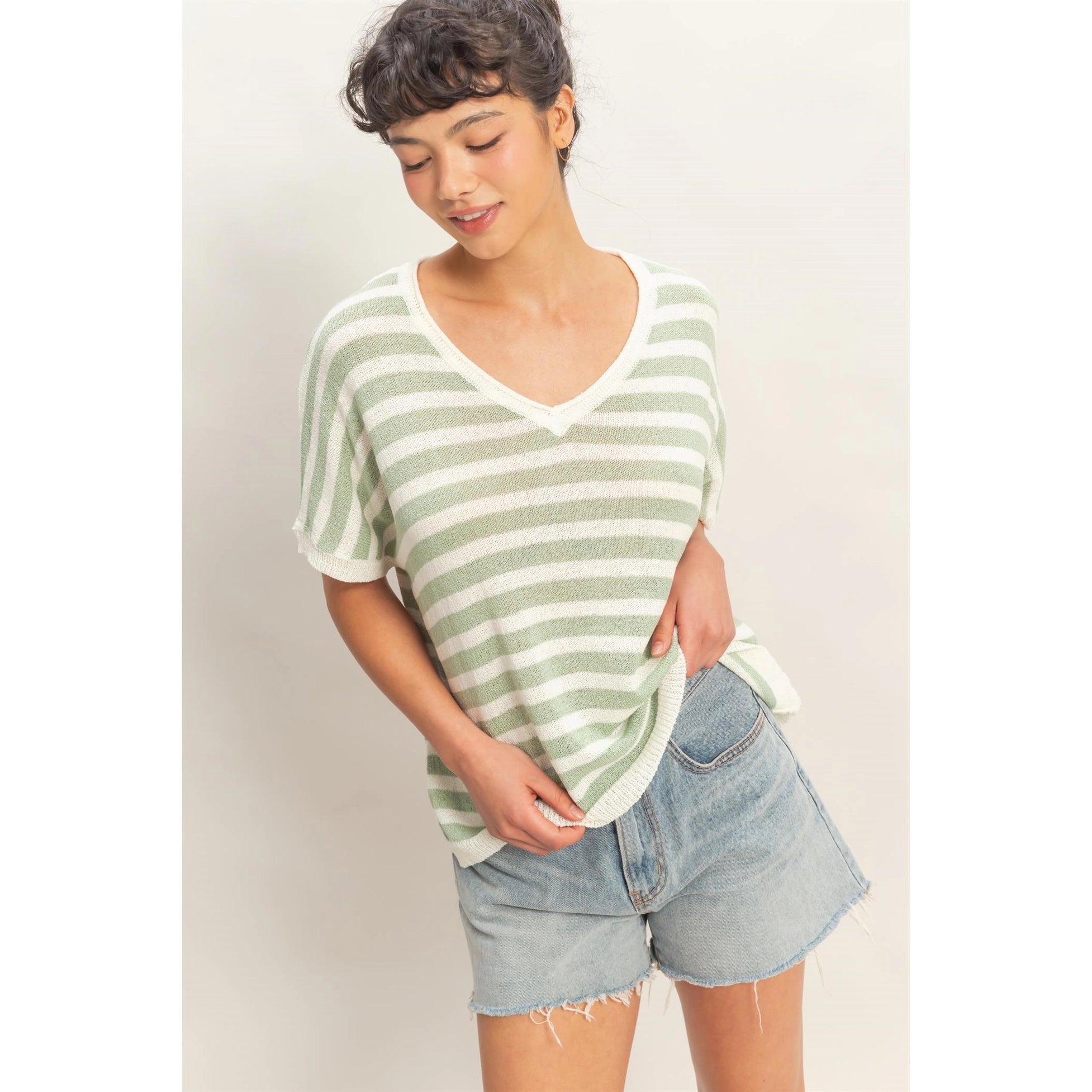 Embrace leisure with this breezy striped knit top, featuring a flattering ribbed V-neckline. The design highlights short dolman sleeves with ribbed cuffs for a laid-back feel. Cut in a generous oversized fit, it drapes effortlessly. Pair this soft essential with fitted denim and sneakers for a polished weekend look.