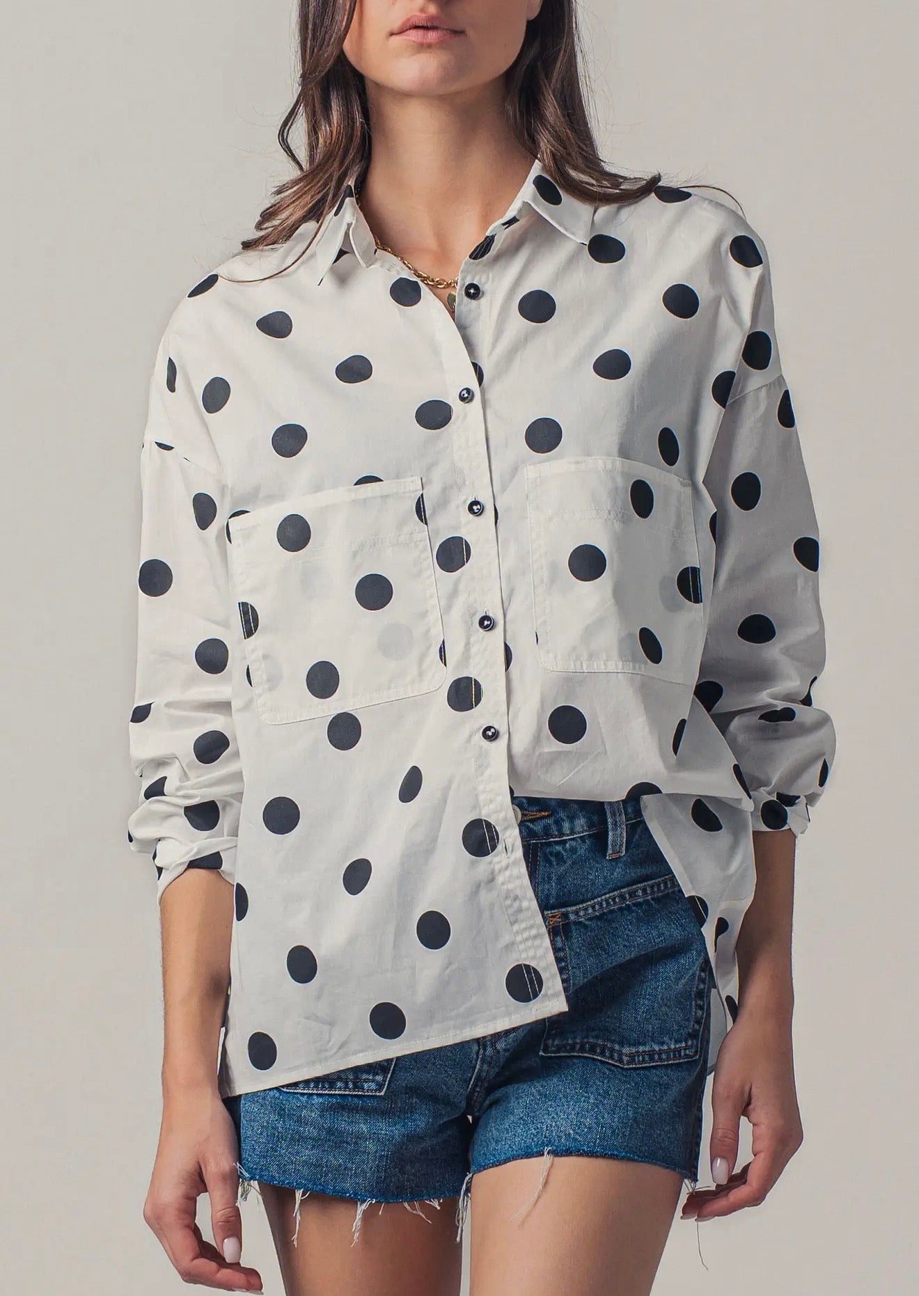 This polka dot pattern, button-down shirt offers a trendy relaxed, fit with drop shoulders and long sleeves that can be rolled easily for a casual look. It includes two large patch pockets on the chest and a back yolk with gathered pleating.