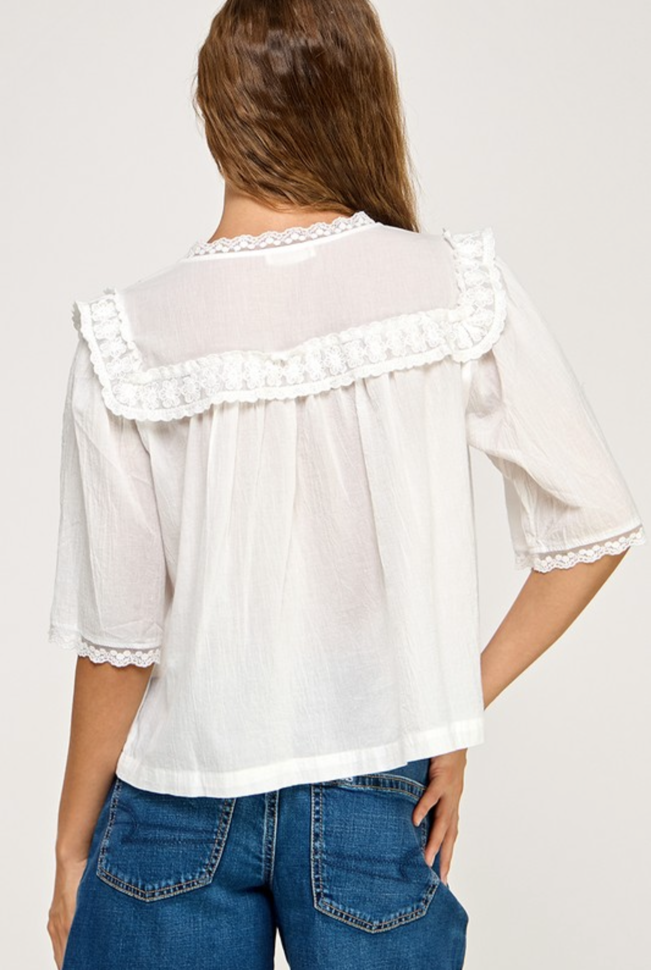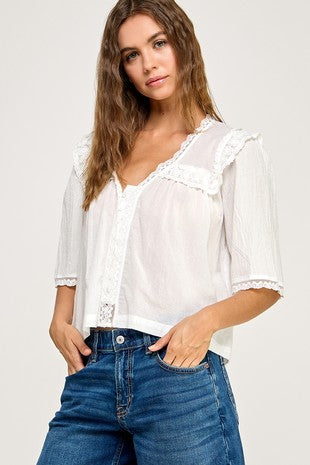 Effortlessly feminine.  This chic top features soft fabric and a relaxed fit with ruffled trim and lace.