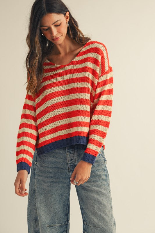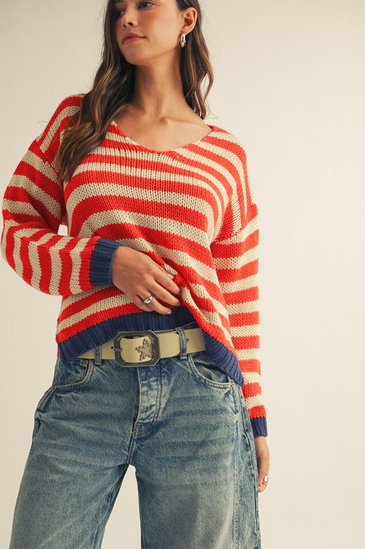 Striped sweater with an accented hem. Perfectly rounded v neck and loose fit. Slits on the side provide an accent and the light weight feel is perfect for wearing year round.